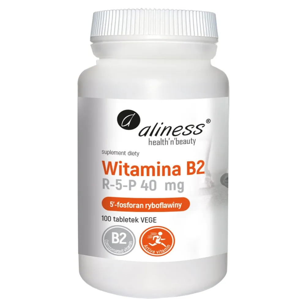 Aliness Vitamin B2 R-5-P 40 mg ist ein Nahrungsergänzungsmittel in Tablettenform mit der aktiven, bioverfügbaren Form von Vitamin B2 – Riboflavin-5′-phosphat (R5P). Dank der koenzymatischen Form kann es vom Körper schneller und effizienter aufgenommen werden.