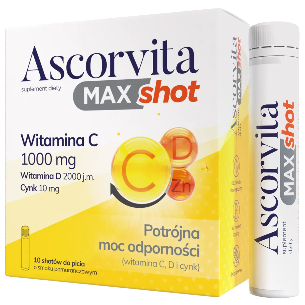 Ascorvita Max Shot ist ein Nahrungsergänzungsmittel in flüssiger Form mit Orangengeschmack. Die Formel zum Verdünnen enthält Vitamin C, unterstützt durch Vitamin D und Zink.