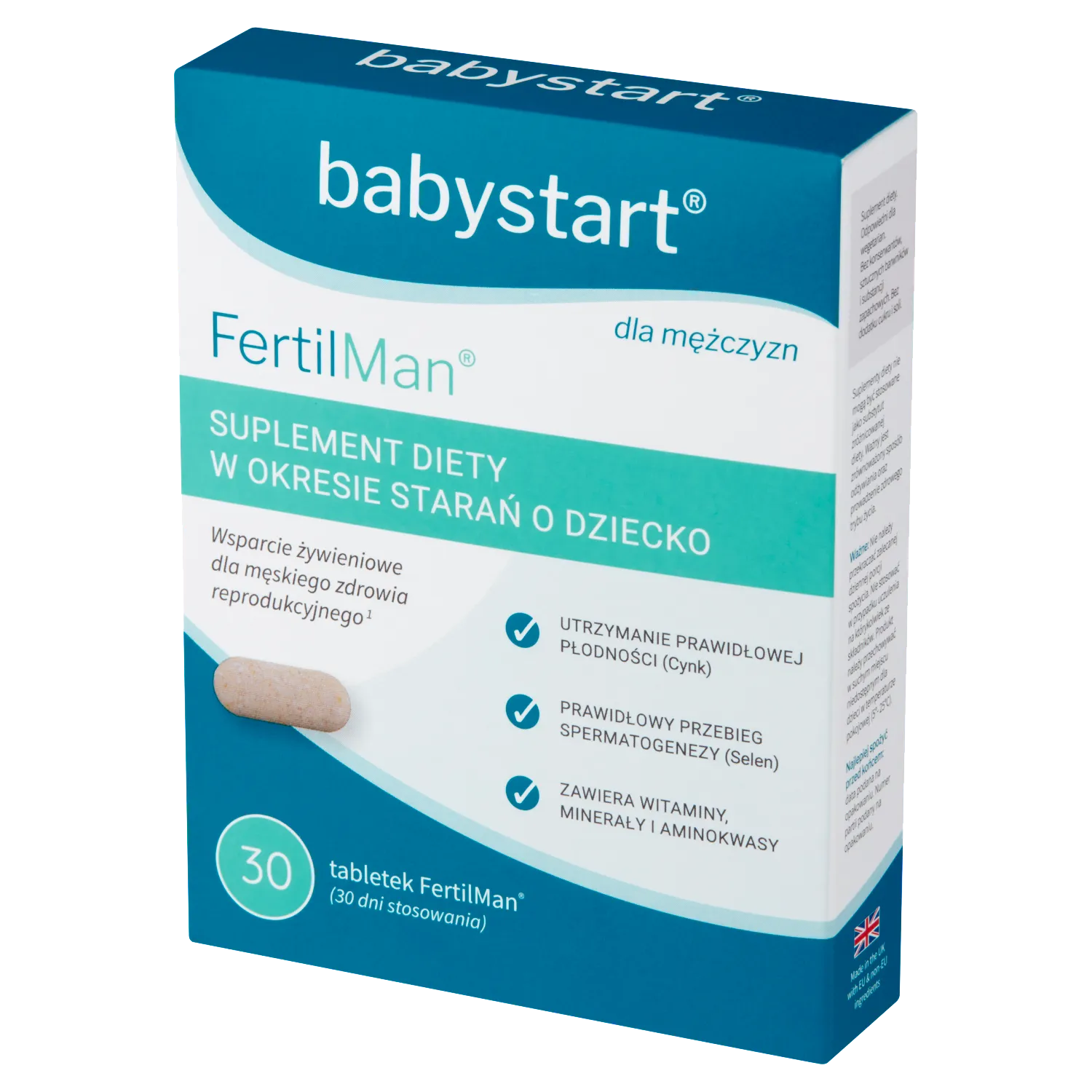 Babystart® FertilMan® ist ein Nahrungsergänzungsmittel in Tablettenform, das zur Ergänzung der täglichen Ernährung von Männern entwickelt wurde. Es enthält die Vitamine C, E, D, B2, B6, B12 und Niacin sowie die Mineralstoffe Eisen, Selen, Zink und Magnesium. Die Formel wurde zusätzlich mit Aminosäuren (L-Arginin, L-Carnitin, L-Taurin) sowie Coenzym Q10 und Folsäure angereichert.