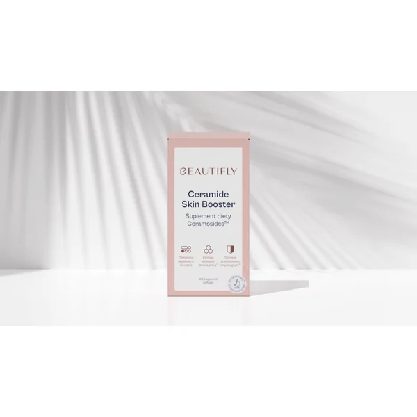 Das Nahrungsergänzungsmittel Beautifly Ceramide Skin Booster basiert auf dem Inhaltsstoff Ceramosides™ Oil Neutra. Es ist eine hochkonzentrierte Quelle für Phytoceramide, die aus Weizen gewonnen werden. Bei oraler Einnahme helfen sie, den angemessenen Ceramidspiegel in der Haut wiederherzustellen. Es liefert polare Lipide und Sphingolipide, die die Struktur der Zellmembranen bilden. Klinische Studien haben gezeigt, dass der Wirkstoff feuchtigkeitsspendende und anti-aging Effekte bereits nach 15 Tagen der Einnahme der Kapseln bietet. Die Formel des Nahrungsergänzungsmittels Beautifly Ceramide Skin Booster wird durch die antioxidativen Vitamine A und E ergänzt. Vitamin A unterstützt die Produktion von Kollagen und Elastin in der Haut, was zu einer verbesserten Spannkraft und Elastizität beiträgt. Es wirkt auch Schäden durch freie Radikale entgegen und reduziert übermäßige Talgproduktion, wodurch Akne-Symptome gemildert werden. Vitamin E stärkt die Schutzbarriere der Haut und erhöht ihre Widerstandsfähigkeit gegen Schadstoffe und UV-Strahlung.