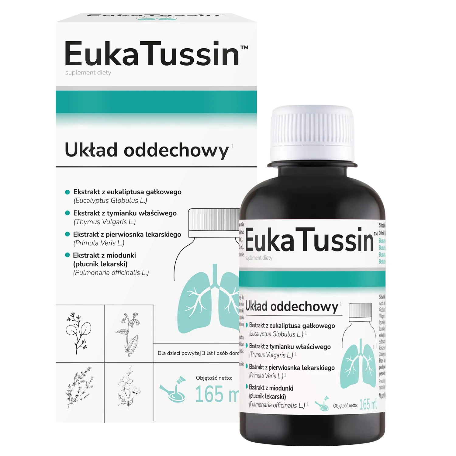 Die Flasche enthält 165 ml des flüssigen Nahrungsergänzungsmittels EukaTussin.