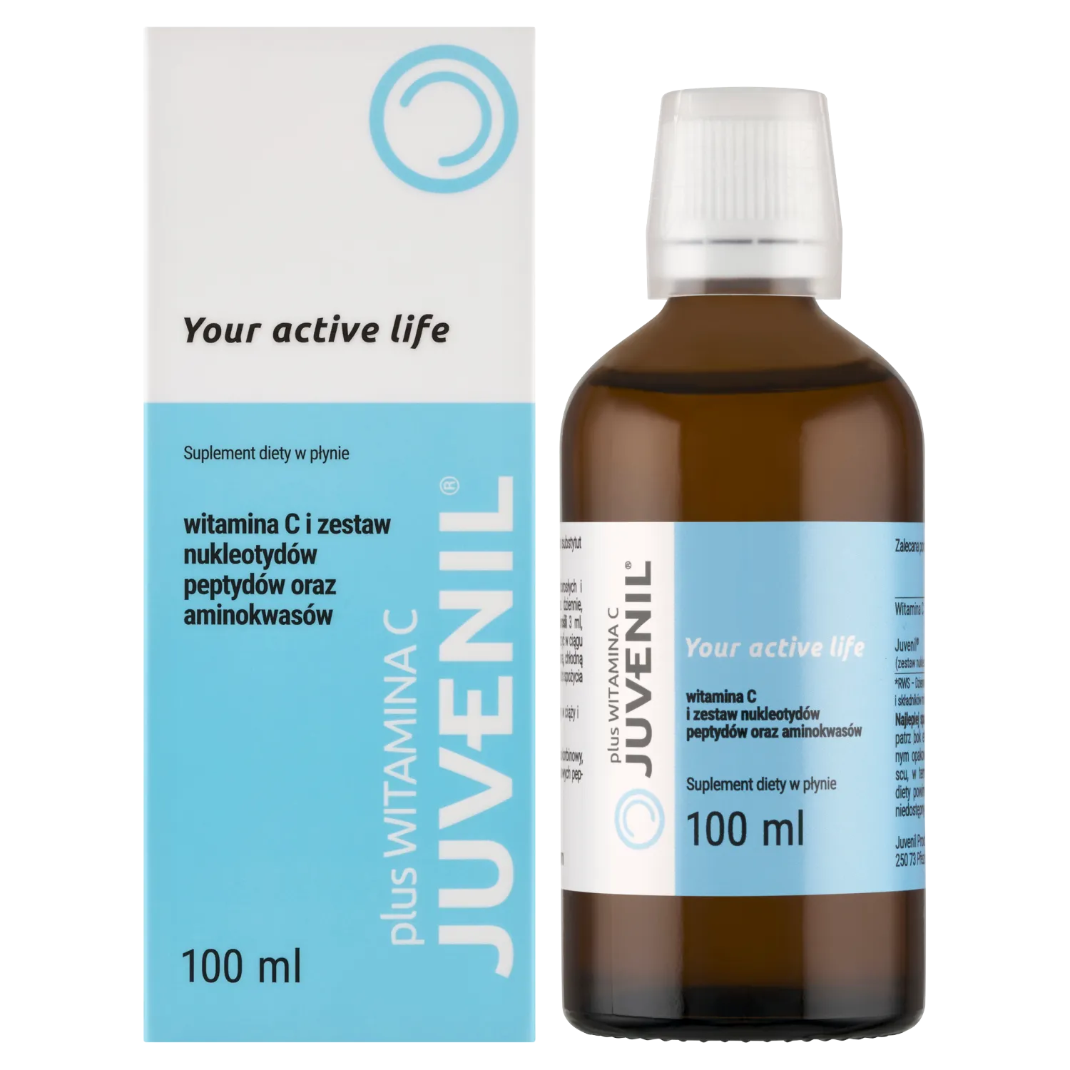 Juvenil Plus Vitamin C ist ein flüssiges Nahrungsergänzungsmittel, das Vitamin C sowie einen Komplex aus Nukleotiden, Peptiden und Aminosäuren enthält. Das Produkt ist für Erwachsene sowie für Kinder ab 1 Jahr geeignet.