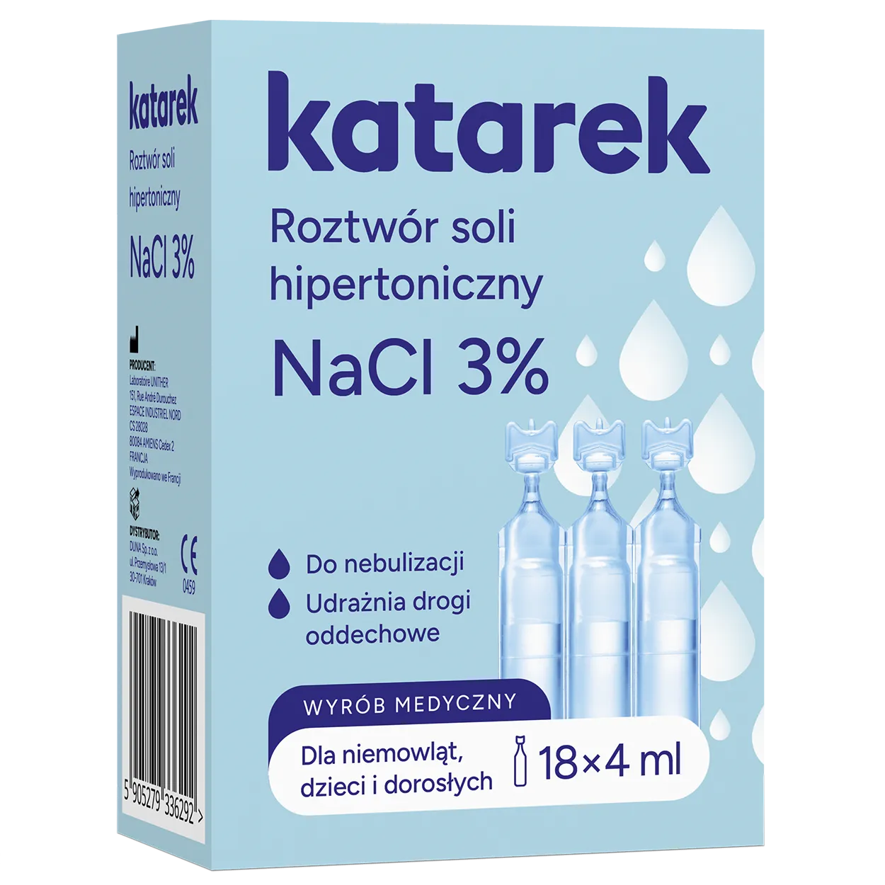 Katarek hypertone Kochsalzlösung NaCl 3 % ist eine Salzlösung in Ampullen, ideal zur Inhalation für Säuglinge bereits ab den ersten Lebenstagen sowie für Kinder und Erwachsene. Das Produkt ist mit pneumatischen und Ultraschall-Nebulisatoren kompatibel und stellt damit eine praktische und vielseitige Lösung für die ganze Familie dar.
