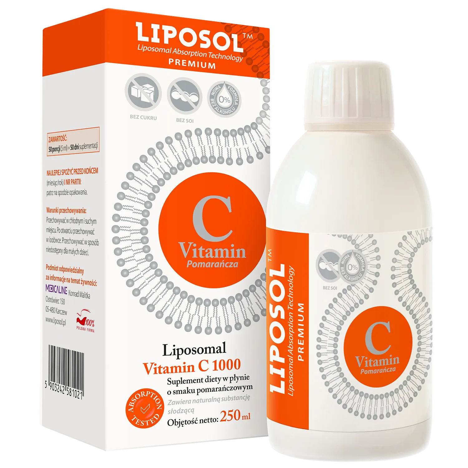 Liposol Liposomales Vitamin C ist ein flüssiges Nahrungsergänzungsmittel mit angenehmem Orangengeschmack. Das Produkt wurde zur Ergänzung der täglichen Ernährung von Erwachsenen mit Vitamin C entwickelt. Die Tagesportion enthält 1000 mg Vitamin C, was 1250 % der Referenzmenge entspricht.