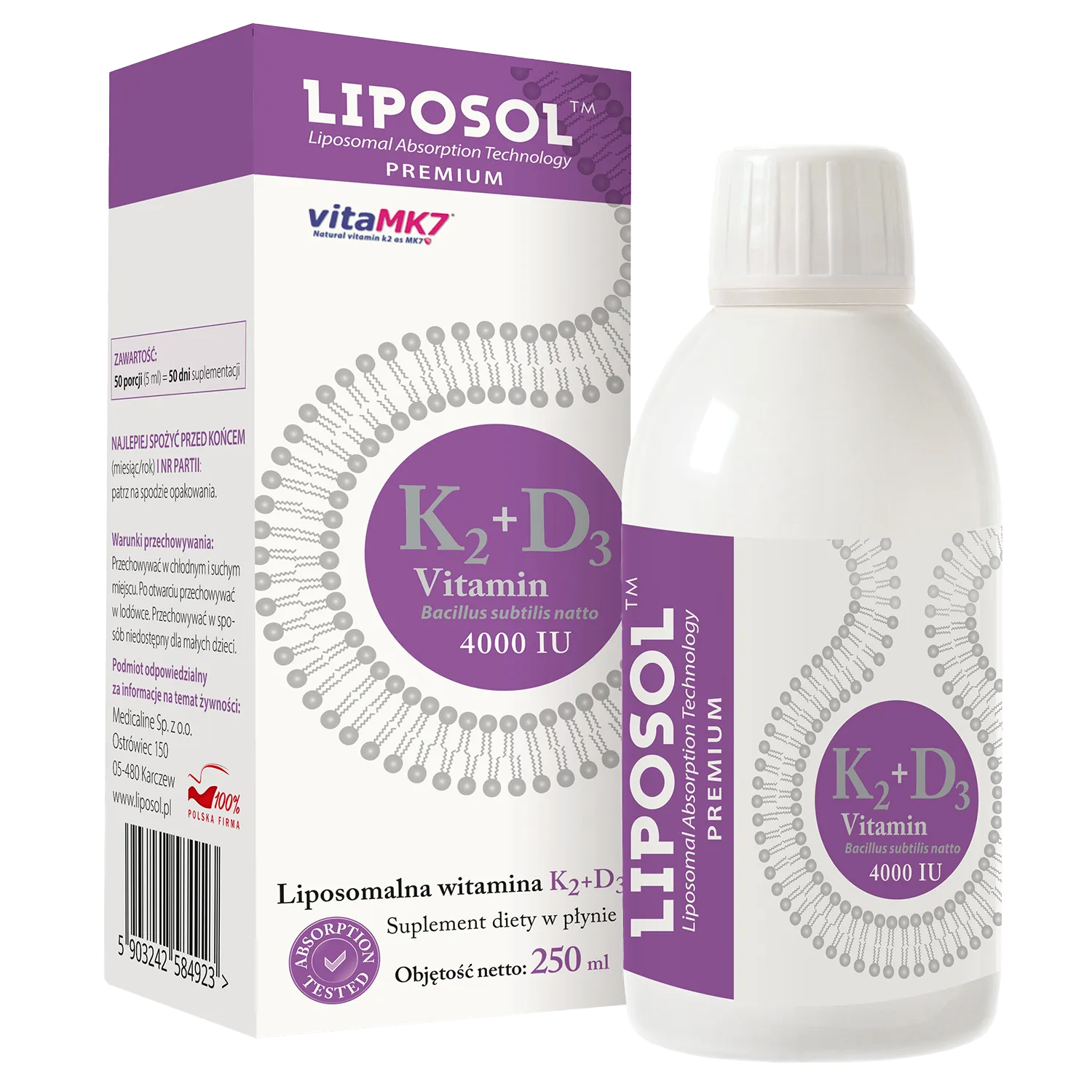 Liposol Liposomales Vitamin K2 + D3 ist ein flüssiges Nahrungsergänzungsmittel für Erwachsene. Vitamin K (VitaMK7® aus Fermentation von Bacillus subtilis natto) und Vitamin D3 sind in Liposomen eingeschlossen und in hochwertigem kaltgepresstem Extra Virgin Olivenöl gelöst.