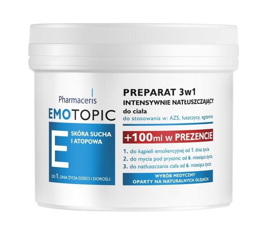 - Das 3in1 Pharmaceris E Emotopic intensiv rückfettende Präparat vereint die Funktionen einer Creme, Emulsion zum Duschen und Baden. Es wird für Menschen mit trockener, atopischer und schuppiger Haut empfohlen. Es hilft, die Symptome von Hautreizungen zu lindern, die durch AD, Kontaktallergie und Ekzeme verursacht werden. Es trägt zur Linderung juckender Haut bei. Stärkt und erneuert die natürliche Lipidbarriere, die die Haut vor irritierenden äußeren Faktoren schützt.