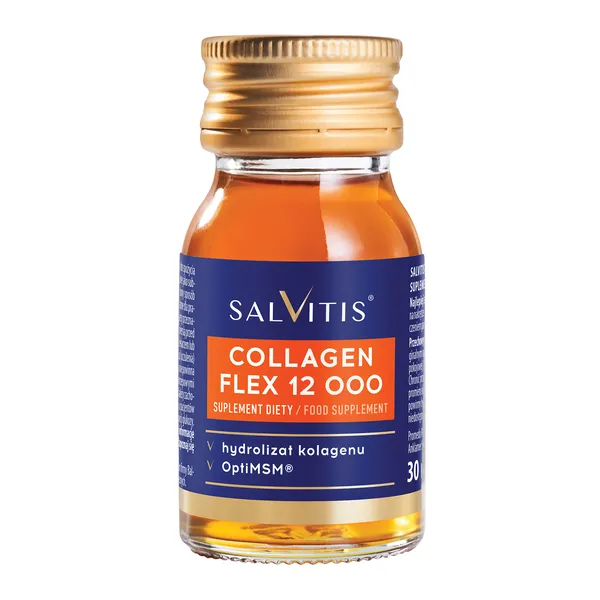Salvitis Collagen Flex ist ein Nahrungsergänzungsmittel in flüssiger Form, das pro Tagesdosis 12 g hydrolysiertes Rinderkollagen enthält. Zusätzlich ist das Produkt mit OptiMSM® (Methylsulfonylmethan), Glucosaminsulfat, Vitamin C sowie Extrakten aus indischem Weihrauch und Bambussprossen angereichert. Die Inhaltsstoffe von Salvitis Collagen Flex fördern die Gesundheit von Gelenken, Knochen und Muskeln. Das Produkt ist für Erwachsene bestimmt.