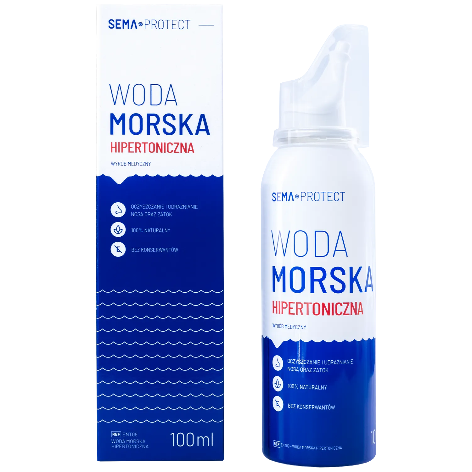 SEMA Protect hypertones Meerwasser ist ein Medizinprodukt zur Verbesserung der Durchgängigkeit von Nase und Nasennebenhöhlen. Die natürliche, hypertone Meerwasserlösung im Spray reinigt die Nasenhöhle und die Nasennebenhöhlen und reduziert Schwellungen der Nasen- und Nebenhöhlenschleimhäute. Dadurch werden die Nasengänge sowie die Öffnungen der Nasennebenhöhlen befreit.