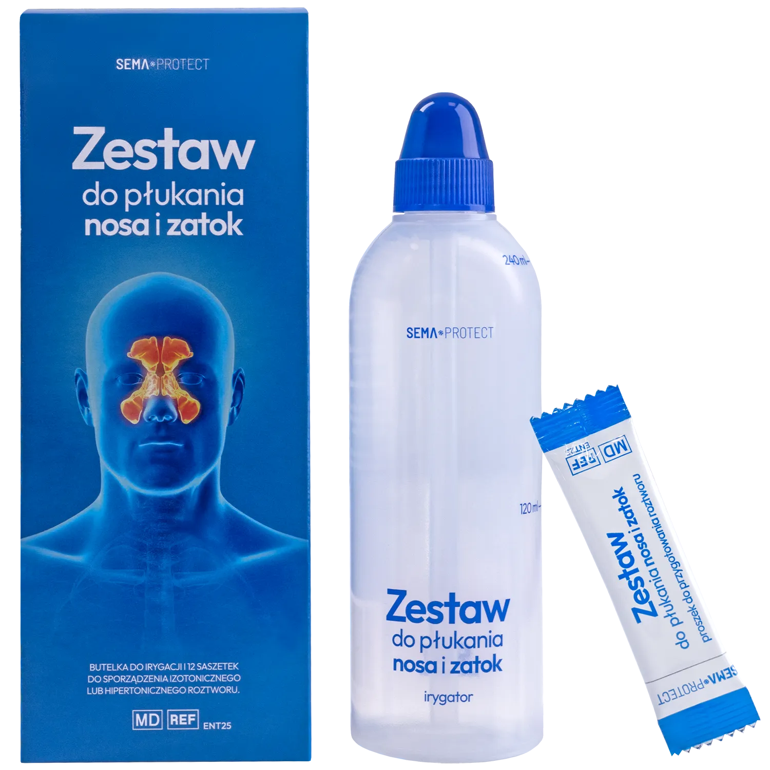 Das SEMA Protect Set enthält einen Irrigator (Nasendusche) sowie 12 Beutel mit löslichem Natriumchlorid zur Zubereitung einer isotonischen oder hypertonischen Lösung für die Nasen- und Nebenhöhlenspülung.