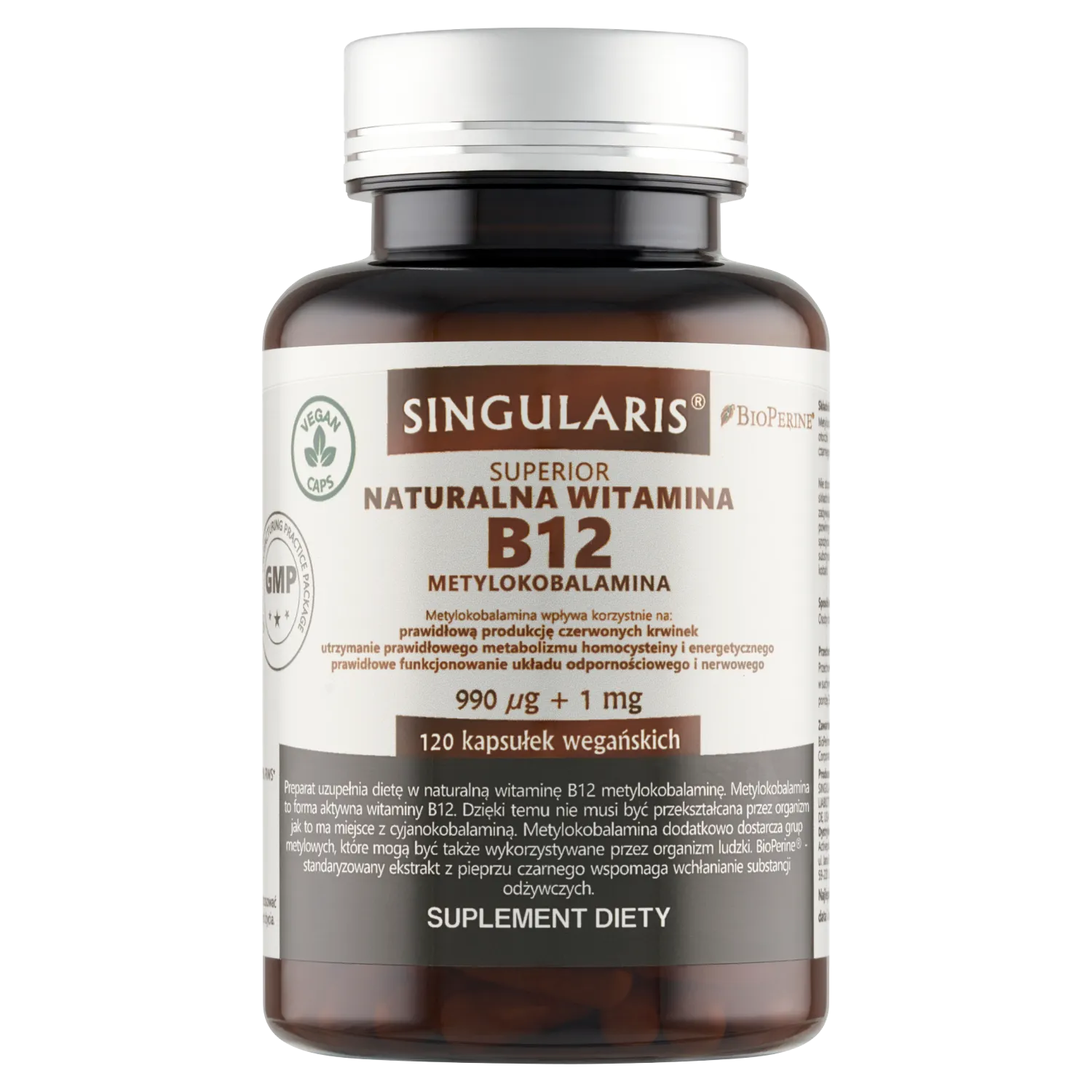 Singularis Superior Natürliches Vitamin B12 Methylcobalamin 990 µg + 1 mg BioPerine® ist ein Nahrungsergänzungsmittel in Kapselform für Erwachsene. Die Formel eignet sich als Ergänzung der täglichen Ernährung und liefert Vitamin B12 in seiner natürlichen, aktiven Form – Methylcobalamin.