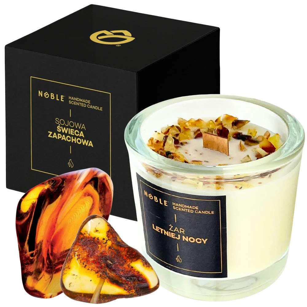 Sommernachtglut von NOBLE ist eine natürliche, handgefertigte Sojakerze mit 210 ml Inhalt, die über 50 Stunden Brenndauer bietet! Sie ist in weißem Glas aus der NOBLE-Kollektion verpackt und garantiert – wie alle unsere Kerzen – maximale Duftintensität und natürliche Freude.