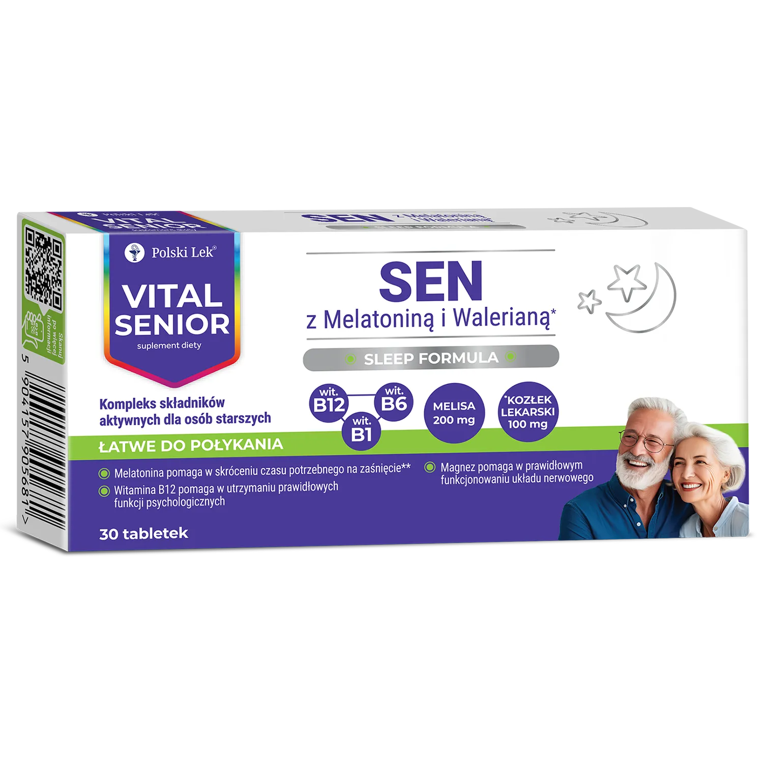 Vital Senior Schlaf ist ein Nahrungsergänzungsmittel in Form von Filmtabletten, entwickelt für Erwachsene, insbesondere Senioren.