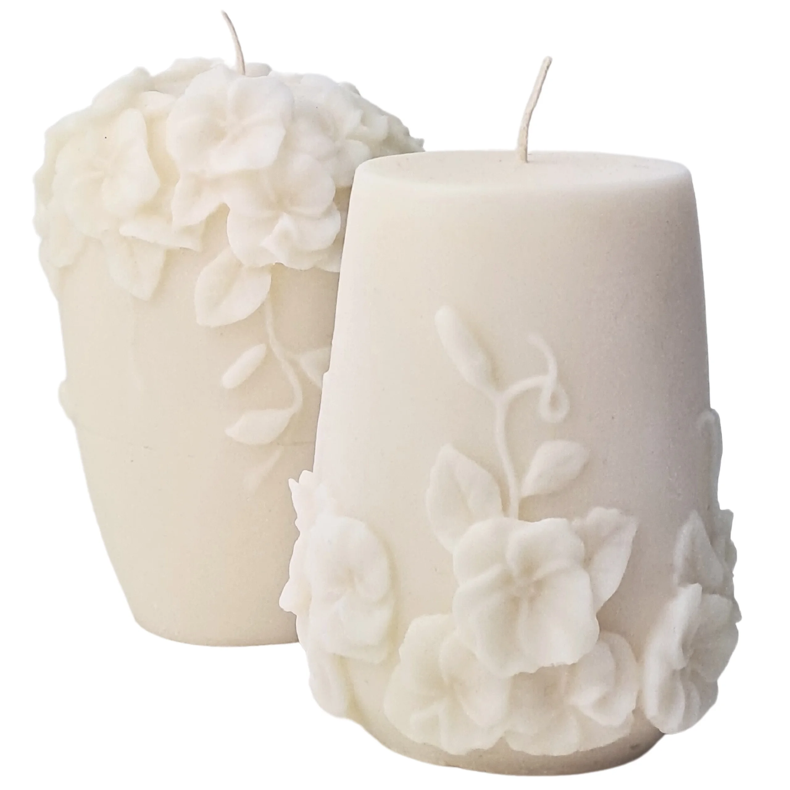 Set mit Sojakerzen mit Blumen. Natürlicher, ungiftiger Sojawachs eignet sich zum Abbrennen in Innenräumen und ist gesundheitlich unbedenklich.